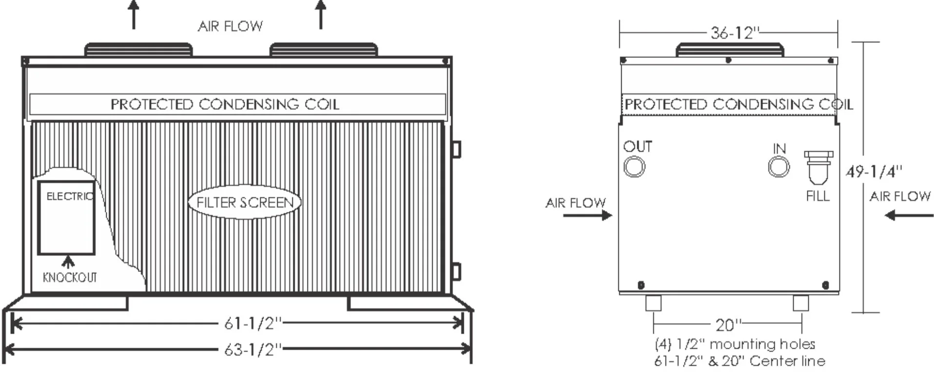 With a water tank capacity of 40 gallons, a stainless steel pump with a ball valve, and all-weather-tight components, this chiller is designed to withstand various environmental conditions. The G-90 galvanized cabinet and non-corroding insulated water tank ensure durability and longevity, making it a reliable choice for long-term use.